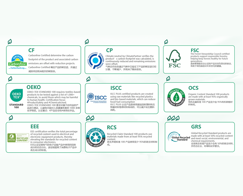 The commonly used certifications on the market currently include CF, CP, FSC, OEKO, ISCC, OCS, EEE, RCS, and GRS, covering almost all types of products. It is worth mentioning that CF (Carbon Free) certification, due to its excellent wide applicability, has become the top choice for many sellers to apply for climate green labels on the Amazon platform. These certifications not only help sellers enhance the environmental image of their products, but also meet consumers' demand for sustainable products, bringing more market opportunities for brands.